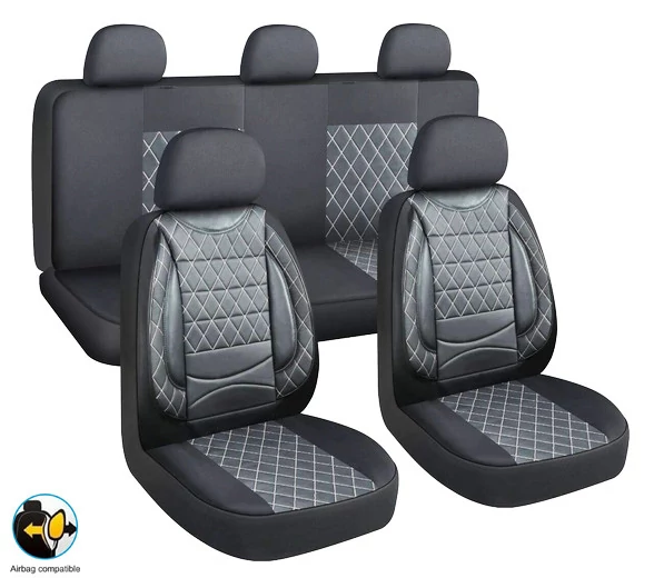Az 11 részes univerzális műbőr üléshuzat szett fekete-fehér színben készült. Az univerzális méretnek és a rögzíthetőségnek köszönhetően számos autótípussal kompatibilis. A huzatok fém rögzítőkampók segítségével rögzíthetők az ülésekhez, így a felszerelés gyorsan elvégezhető az ülés alján. A szett légzsákkal szerelt autókkal is kompatibilis, valamint 30°C-on mosható. Az anyag strapabíró és ellenálló, ugyanakkor rugalmas kialakítású. A hátsó ülés huzata két helyen osztható kialakítású.