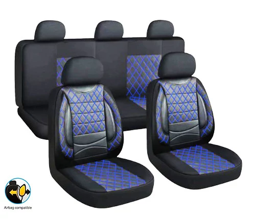 Az 11 részes univerzális műbőr üléshuzat szett fekete/kék színkombinációban készült, amely sportos és elegáns megjelenést ad az autó belső terének. A huzat segít megóvni az eredeti kárpitot a kopástól, szennyeződésektől és a mindennapi használat során keletkező igénybevételtől. Az univerzális kialakításnak köszönhetően a szett a legtöbb autótípushoz használható. A huzatok rögzítése fém rögzítőkampókkal történik, amelyek stabilan tartják a huzatot az ülésen. A huzat légzsák-kompatibilis kialakítású, így nem akadályozza az autó biztonsági rendszereinek működését. A hátsó ülés huzata két helyen osztható, ezért a legtöbb osztott hátsó ülés kialakításához is könnyen igazítható. Az anyag strapabíró, rugalmas és könnyen tisztítható műbőr, amely 30°C-on mosható.