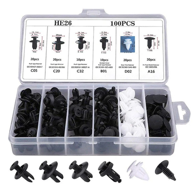 A 100 darabos autó patent szett praktikus megoldást kínál különböző karosszéria elemek rögzítéséhez. A készlet többféle típusú műanyag patentet tartalmaz, amelyek különböző rögzítési pontokon használhatók.