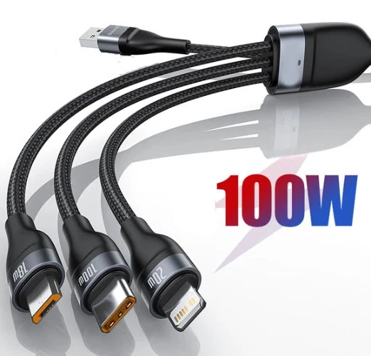A 3 az 1-ben gyorstöltő kábel ideális megoldás azok számára, akik többféle eszközt szeretnének tölteni egyetlen kábellel. A kábel három különböző csatlakozóval rendelkezik, így kompatibilis a Micro USB, USB-C és Lightning csatlakozós készülékekkel. A 6A / 100W teljesítmény gyors és hatékony töltést biztosít, így alkalmas okostelefonok, táblagépek és más kompatibilis eszközök töltésére is. A kábel alumínium ötvözet csatlakozókkal és strapabíró nylon borítással készült, amely ellenáll a mindennapi használat során fellépő igénybevételnek. A tartós kialakítás segít megvédeni a kábelt a töréstől és a kopástól. A 1,2 méteres kábelhossz kényelmes használatot biztosít autóban, otthon vagy munkahelyen is. Ez a 3 az 1-ben gyorstöltő kábel praktikus és sokoldalú megoldás, amely lehetővé teszi többféle eszköz egyszerű és gyors töltését.