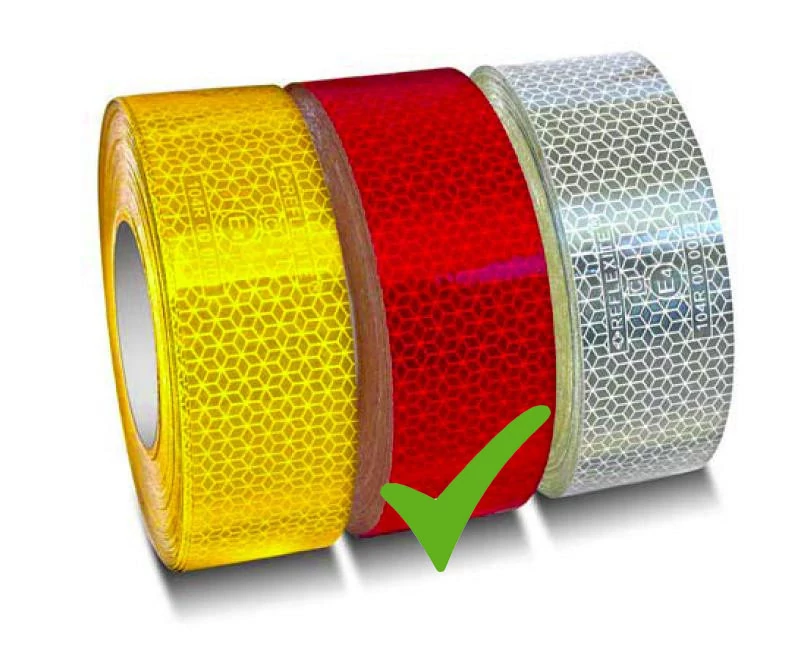 A piros fényvisszaverő szalag „E” jellel rendelkezik, így Európában használható. A 45 méter hosszú és 50 mm széles szalag mikroprizmás kialakításának köszönhetően nagy távolságból is jó láthatóságot biztosít. Erős, tartós és könnyen felhelyezhető, ellenáll az időjárásnak és a szennyeződéseknek. Alacsony hőmérsékleten is erőteljesen tapad, valamint ellenáll a gyenge savnak, lúgnak, sóoldatnak és az esetenkénti üzemanyag kifolyásnak.