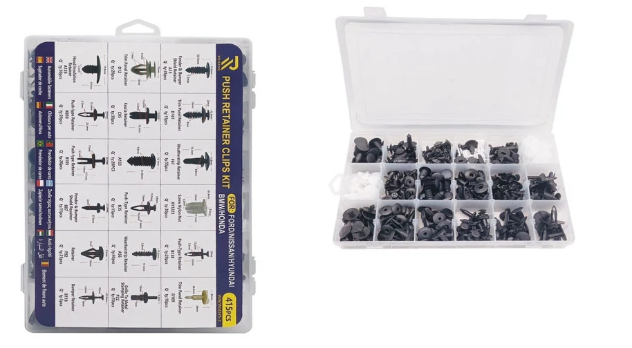 A 415 darabos autó patent szett különböző rögzítő patenteket tartalmaz, amelyek használhatók többek között ajtópanelekhez, lökhárítókhoz, ajtókapcsok ütközőihez, fröccsenésvédő konzolokhoz vagy motorháztető elemek rögzítéséhez.