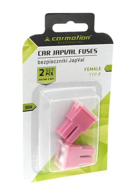 A JapVal autó biztosíték 30A terhelhetőséggel készült, rózsaszín színben. Type F kivitele biztosítja a kompatibilitást a megfelelő járművek elektromos rendszerével.