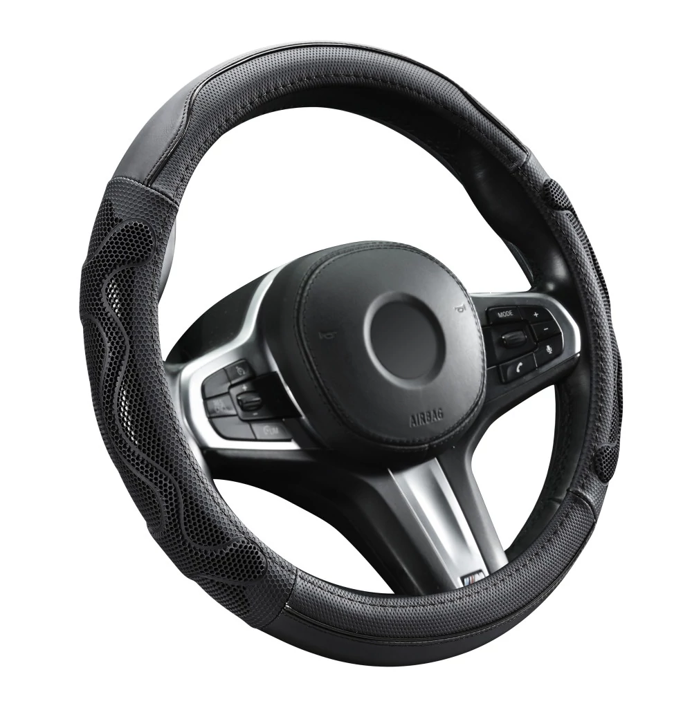 Ez a valódi bőr kormányvédő 38 cm átmérőjű kormányokhoz készült. A kialakítás segíti a kormány védelmét a mindennapi használat során. A belső kialakítás megakadályozza a kormányvédő elfordulását a kormányon. A külső felület kényelmes fogást biztosít vezetés közben. A termék fekete és szürke színkombinációban készült. Könnyen felhelyezhető kialakítású.