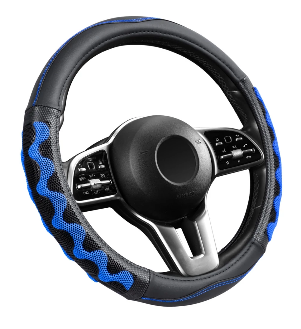 Műbőr kormányvédő fekete-kék színben, amely 38 cm átmérőjű kormányokhoz használható. A kiváló minőségű bőr hatású külső felület kényelmes fogást biztosít vezetés közben. A belső kialakítás segít megakadályozni, hogy a kormányvédő elforduljon a kormányon, így stabil használatot biztosít. A termék szintetikus anyagból készült, és egyszerűen, gyorsan felhelyezhető, így praktikus megoldás a mindennapi használat során.
