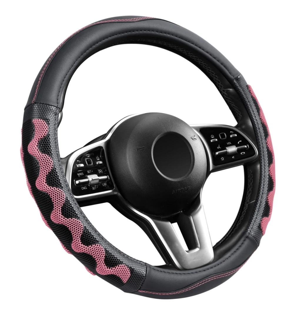 Ez a műbőr kormányvédő 38 cm átmérőjű kormányokhoz készült, fekete-pink kivitelben. Kiváló minőségű, bőr hatású felülettel rendelkezik, amely kényelmes fogást biztosít vezetés közben. Belső kialakítása segít megakadályozni, hogy a kormányvédő elforduljon a kormányon, így stabil használatot biztosít. A termék könnyen felhelyezhető. Anyaga szintetikus.