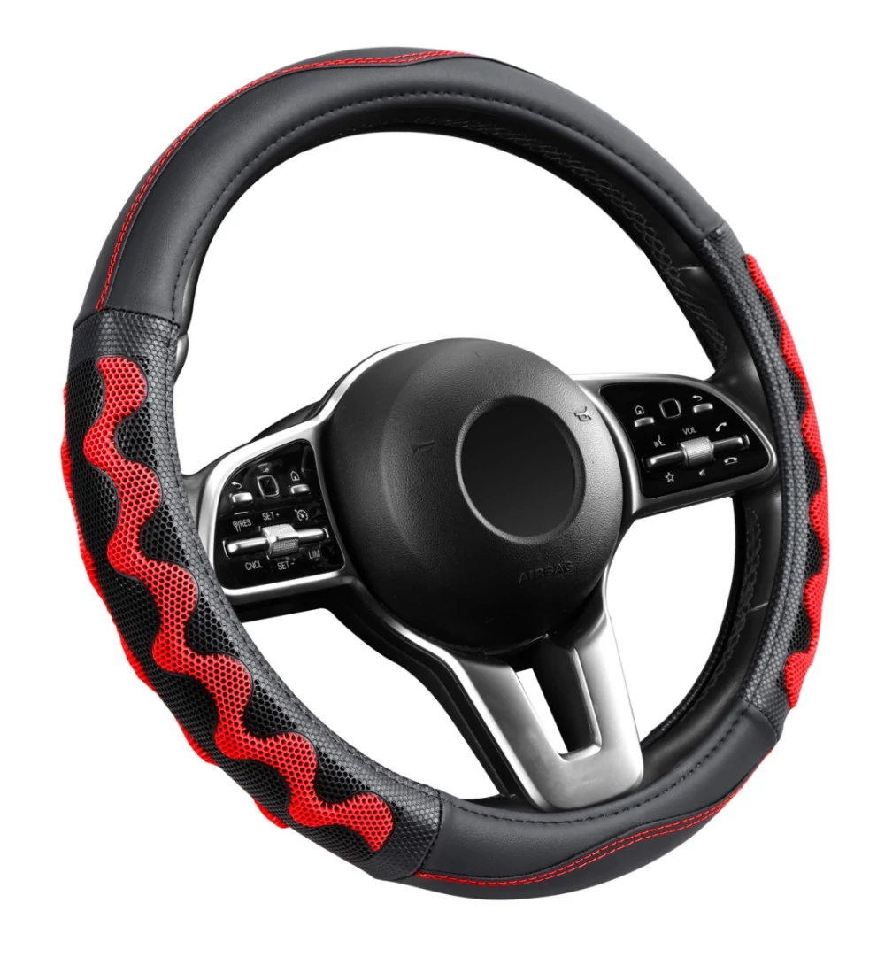 Műbőr kormányvédő fekete-piros színben, amely 38 cm átmérőjű kormányokhoz használható. A kiváló minőségű bőr hatású külső felület kényelmes fogást biztosít vezetés közben. A belső kialakítás segít megakadályozni, hogy a kormányvédő elforduljon a kormányon, így stabil használatot biztosít. A termék szintetikus anyagból készült, és egyszerűen, gyorsan felhelyezhető, így praktikus megoldás a mindennapi használat során.