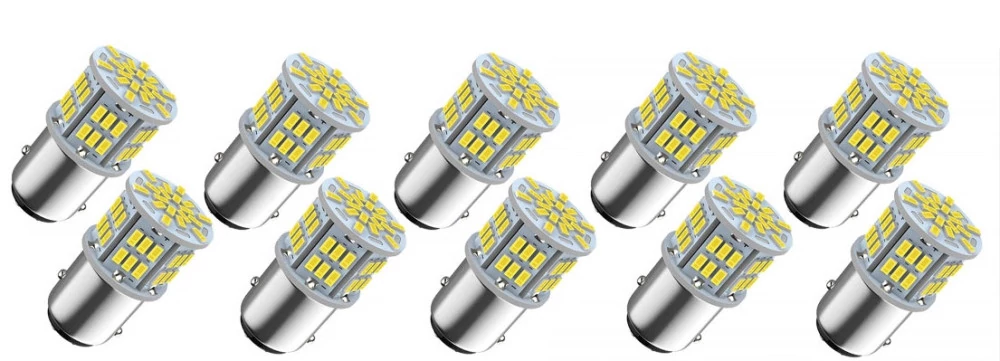 Ez az 1157 foglalatú LED izzó 54 darab SMD LED-del készült, 12V működési feszültséggel. Hidegfehér (6000K) színhőmérséklettel használható. Hűtőbordás kialakítással rendelkezik, és a csomag 10 darab izzót tartalmaz. Az ár 10 darabra értendő.