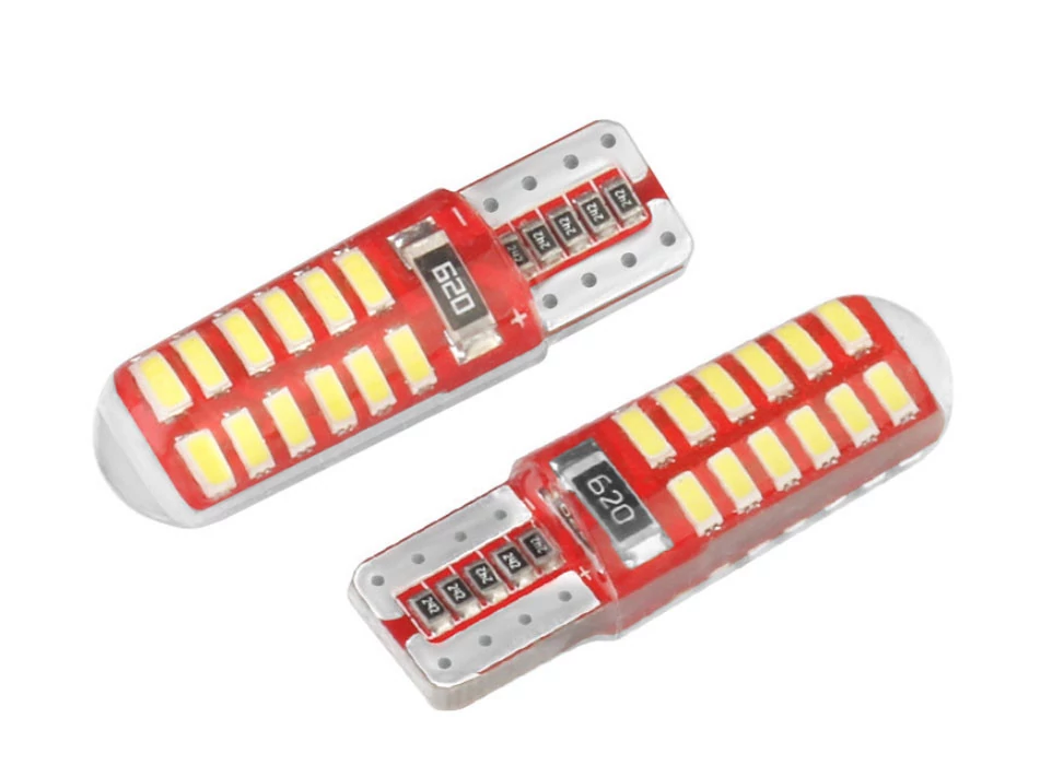 T10 (W5W) LED izzó szett, amely szilikon borítású kivitelben készült 24 darab 3014 SMD LED-del. CANBUS kompatibilis, 12V rendszerhez használható.