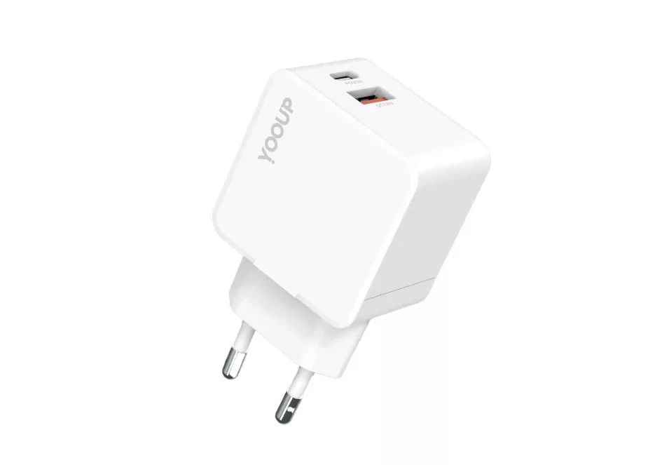 A YOOUP 30W dupla hálózati töltő USB és Type-C porttal lehetővé teszi több eszköz egyidejű töltését. Kompakt kialakítása ideális otthoni vagy utazási használatra.